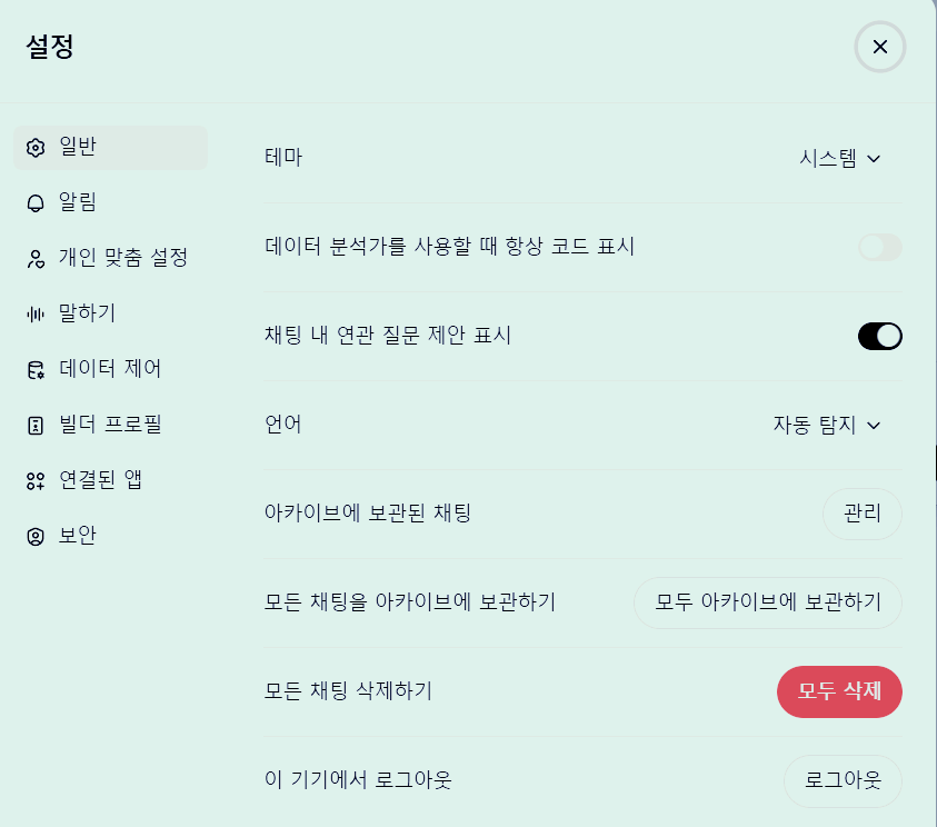 4) 설정에 들어 가셔서 빨강 버튼 모두 삭제를 누르시면 쳇gpt와 대화 내용이 다 지워집니다.